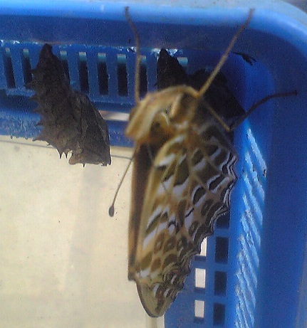 蝶が羽化しました。ツマグロヒョウモンです。家のパンジーについていましたが、2週間前に這い出していたものを、ケースに入れたら、あっという間に蛹になり、昨日羽化し、子供の日に飛び立っていきました。