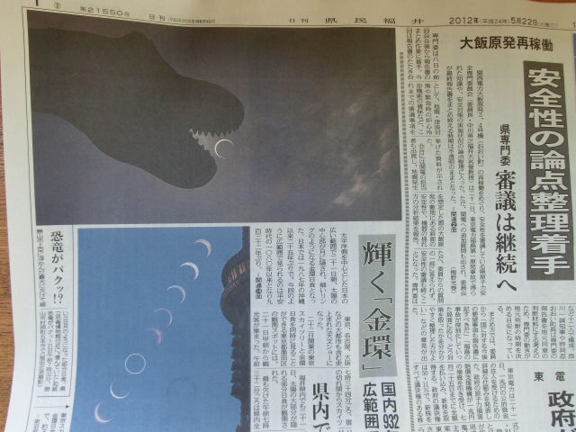 夜中は雲が多く心配でしたが、朝は雲も少なくなり、雲を出入りしながら金環食を家族でベランダで眺めることが出来ました。家族用に買った一個50円のサングラス5個、太陽が明るすぎたので急遽レンズ(フィルター)10個バラシ重ねて交代で見ました。食の進みに応じて6~9枚重ねると良く見えました(笑)また同じく携帯でも撮影しました。