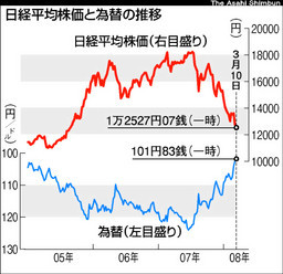 米国の低所得者向け(サブプライム)住宅ローン問題を発端にした米景気の減速によるドル安が背景にあるだけに、円高と株安が繰り返す展開は続くとの見方は多い。