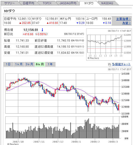 ∇ダウ:12,156.81(+416.66) ナスダック総合指数:2,255.76(+86.42) S&P500:1,320.65(47.28)