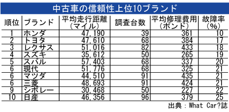 ”英国の中古車市場で最も信頼性が高いのは日本車――。自動車選びの専門誌What Car?と自動車保証サービスを手掛けるワランティーダイレクトの実施した調査でそんな結果が出た。