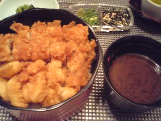 因みに穴子の天ぷらとえびの天ぷら。それにサラダとお新香と赤だしのお味噌汁が付いております。