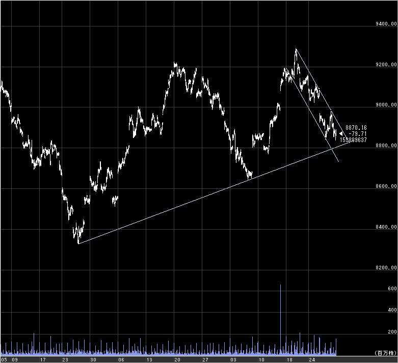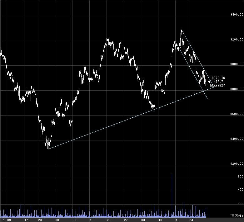 ここ二日は激しい日中の動きでローソク足では包み上げの翌日に包み下げに近いあしでした。