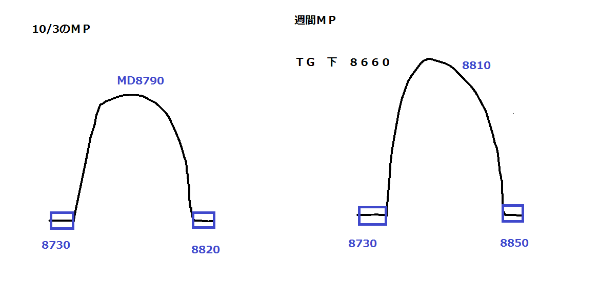 下値めどはN値8680あたりを見ています(週間MPのターゲットも8660ですし、前回安値は8630ですし)