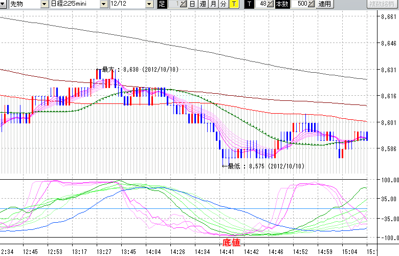 指標ラインの密集点が天底・転換点を示します。指標の見方