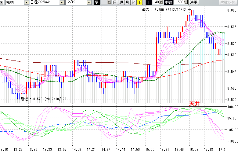指標ラインの密集点が天底・転換点を示します。指標の見方