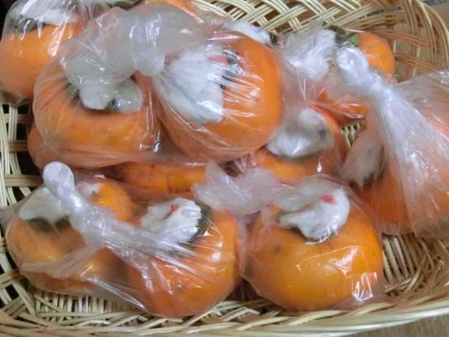 早く食べたかったらこのようにした柿を丈夫なポリ袋にいれて風呂の残り湯などお湯に漬けて置くとよいです