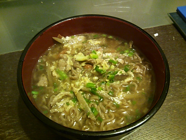 インスタントそばにキンピラの残りに豚肉入れて卵とじし小ネギであしらってみました