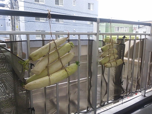 遅く干した大根がベランダに寒そうに下がっている