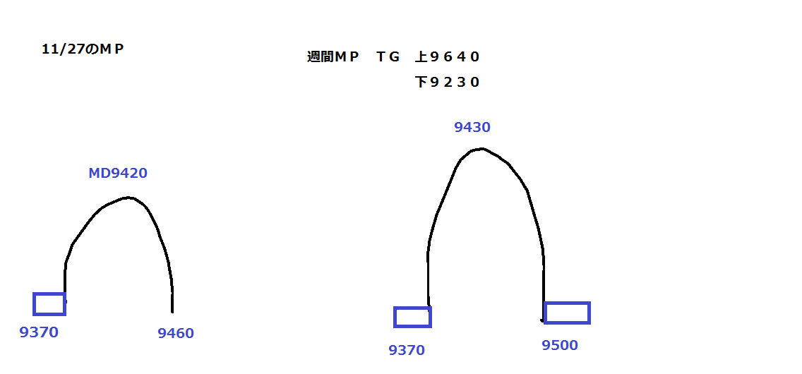 下は9270-9290を埋めたらWディストリ否定で上昇トレンド終了と考えます。