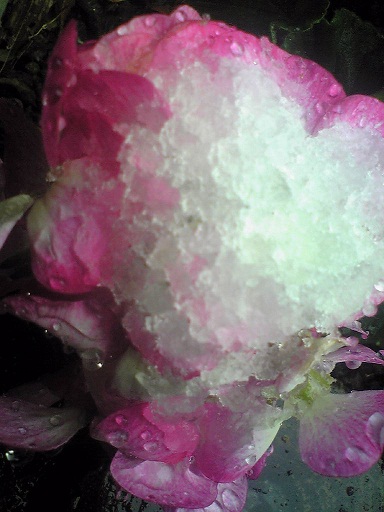 先日の雪で雪が積もったが夏の花がまだ咲いている