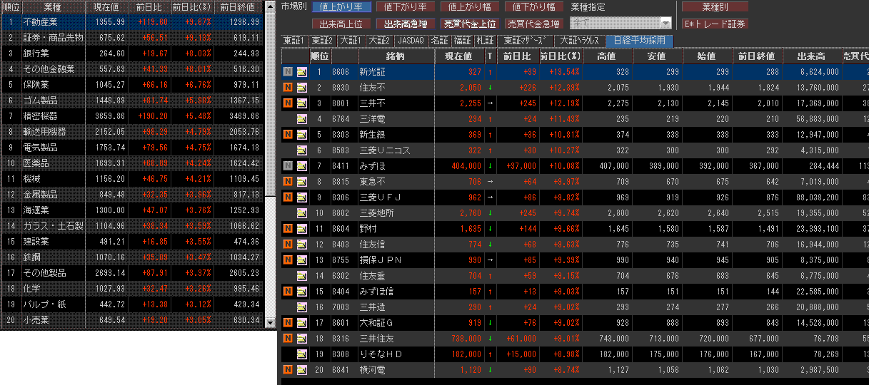 NY市場の大幅高と円安進行を受けて、日本市場も大幅高。不動産とか銀行とかもの凄い上げかたでした。上がっている銘柄は、ショートカバーと裁定買い中心といった感じです。出来高、売買代金はやや増加。4月中旬~5月は、欧米金融機関の決算発表もあるし、ファンドの決算売りとかで毎年下げやすいので、高値追いには注意したいところです。(オプションの手口でちょっと気になることがあるので、今週来週ストンと下がる場面があるかもしれません)