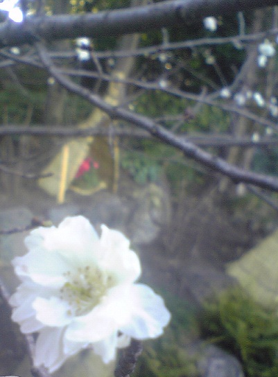 子福桜が見ごろになっている。この時期満開になる桜の一種。奥にちらりと冬牡丹の菰が見える。徳川園にて。