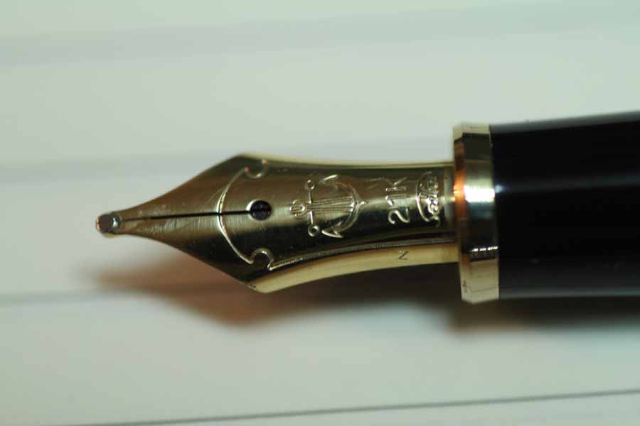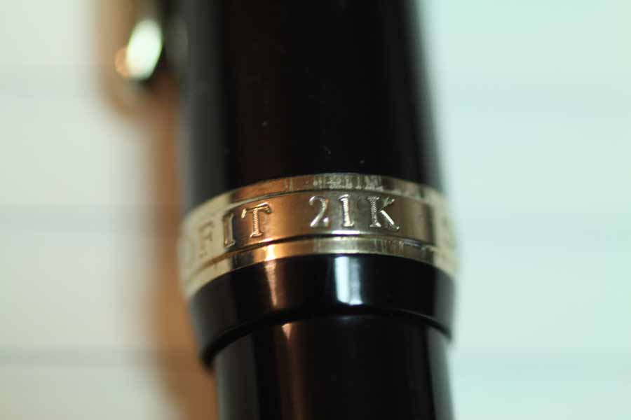 現行品に比べて外見の違いはキャップリングが大ぶりの一重。全般的に金メッキの色合いが薄いです。(後、首軸先端に金色のパーツが嵌っていたり、現行機種と違って14金のニブ(ペン先)に24金メッキは施されてないですね。しかし現行機種はニブが金なのに更に金メッキとか…)