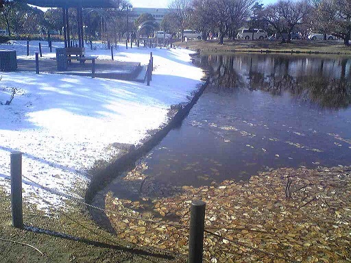 東海市の元浜公園です。氷が張って、雪が残っている。