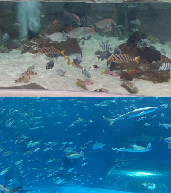 図1:普段食べれる魚もいるわ~水槽の中に道がある施設があったり、
