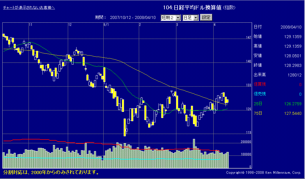 米株安と円高ドル安を受けて日経平均は続落しました。朝方から国内外からの売りバスケットが多く出ていたようで、寄り付き前の外資系証券注文も三日連続で大幅売り越し。上値では売りが出てくるようです。ただ、日経平均はドル建てだと前日とほぼ変わらず。やはりドル円の影響が大きいなといった感じです。
