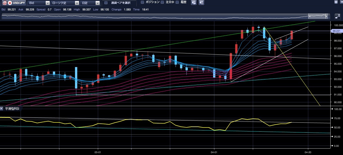 GMMA日足の上限付近からの売りをやってみたが-20pipsで撃沈。サポートの方が強かったし短期線の上限を越えて推移している時間が多かったので見通しが甘かったと反省。