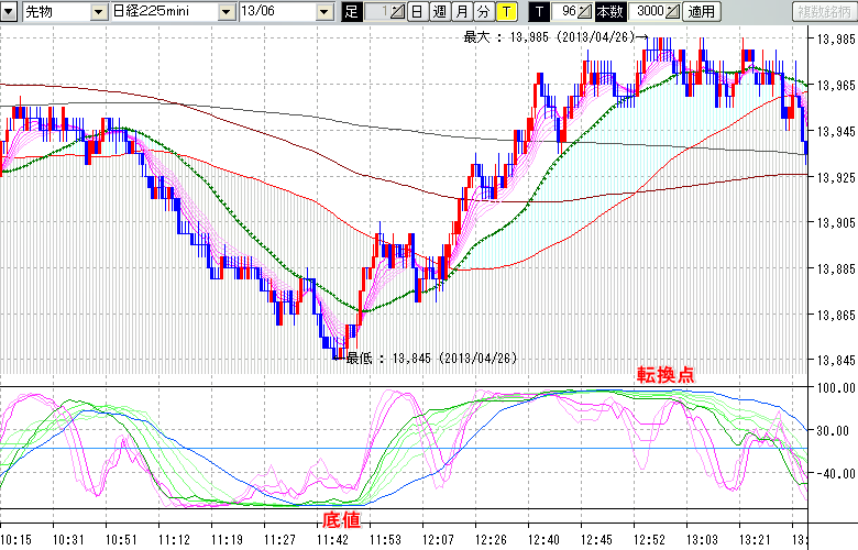 指標ラインの密集点が天底・転換点を示します。指標の見方