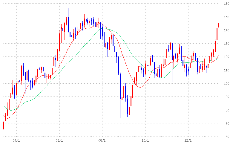 2006年~0227年の、サブプライムショック前後の高値150ドルに迫っております!