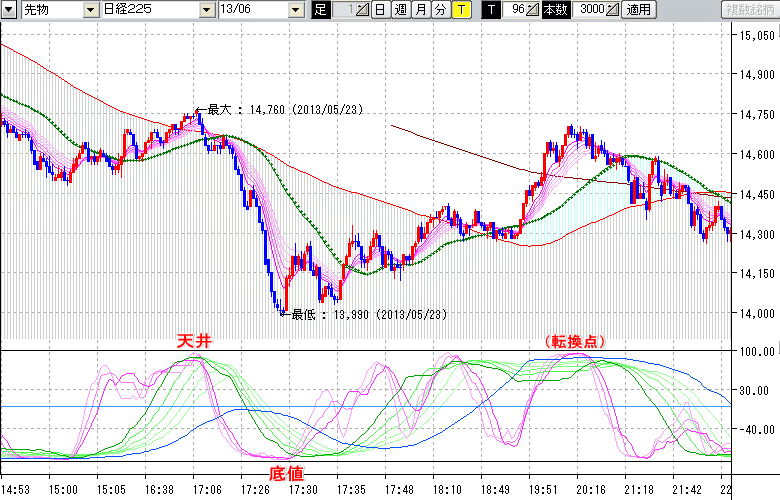 指標ラインの密集点が天底・転換点を示します。指標の見方