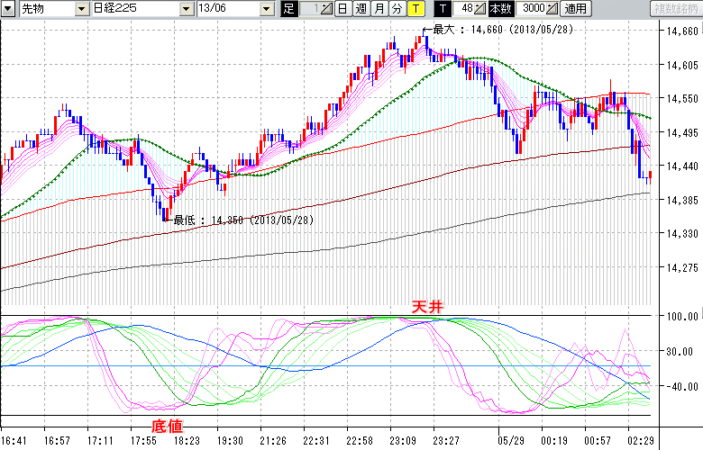 指標ラインの密集点が天底・転換点を示します。指標の見方