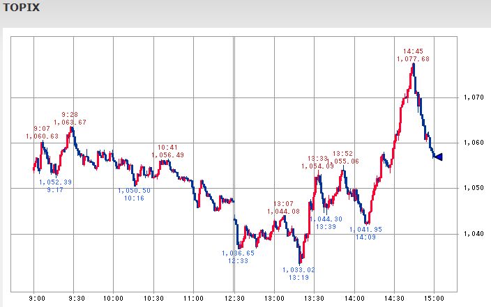 また、前場終値時点で唯一つ業種別平均が値上がりしていた不動産は、日経平均に対して仕掛け的な上昇が為された際にその代表銘柄の三菱地所の出来高が大きく膨らんでおり、アベノミクス期待で大きな上昇を演じてきた不動産株の反発を演出することで、底割れを防ごうという戦術が取られたことが見て取れるのである。
