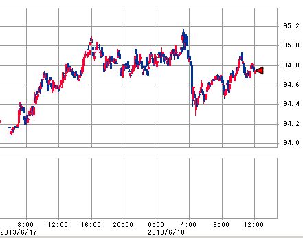 ところが、10:40過ぎくらいから複数回の売り仕掛けと見られる出来高の増加と共に平均株価は急落していますが、この時間帯は単に株価先物だけでなく、為替相場でも円高ドル安の動きが強まっており、為替と先物の合せ業で急落が作り出されていることがわかります。