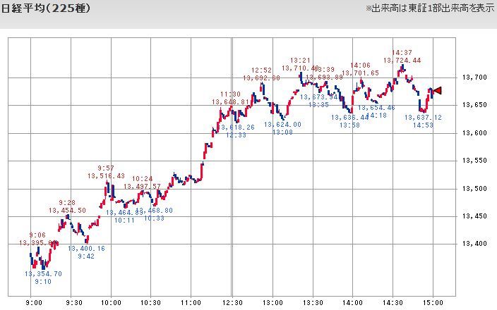 後場に入ってからも比較的堅調な展開が続いていましたが、先物の売り仕掛けを受けて14:37以降に急速に上昇幅を縮めていますが、14時台に後場が始まった香港のハンセン指数が弱含むと同時にシカゴグローベックスのダウ平均先物の価格も下落、ドル円相場もやや円高ドル安傾向になったことを受けて売り方が少し強気に転じたことが影響していると推測されます。