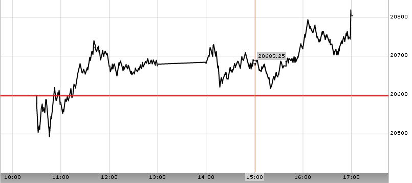 この11:00(シカゴ時間21:00)過ぎの時間帯には実はシカゴグローベックスのダウ平均先物も中国株式市場の上昇の影響からか急激に上昇しており、このことも世界的な株価上昇を想起させて買い方の強気を支援しているものと推測されます。