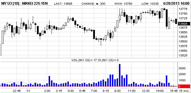 本日の東京市場は昨晩のシカゴ日経平均先物終値13,395円にさや寄せする形よりも前日の東証終値13,213.55円から大幅上昇で始まりました。