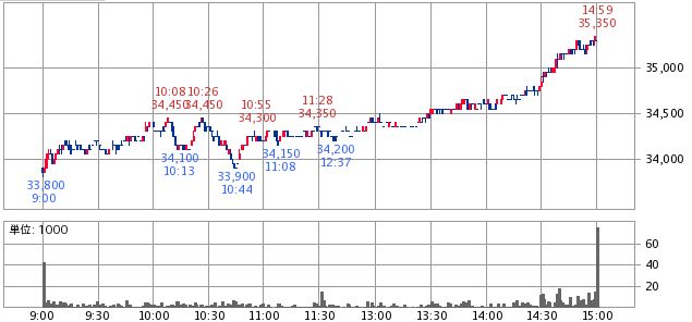 本日の東京市場は前日と同様に円安ドル高やリスクオンへの回帰の影響を受けて、前日比+246.24円(+1.78%)の14,098.74円と続伸して終わっています。