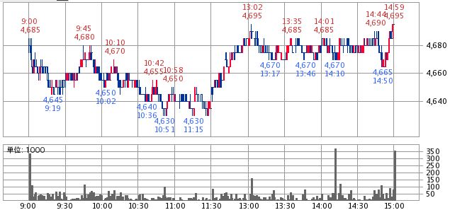 しかし、香港や上海の後場の軟調さへの警戒を材料に売り仕掛けが入って13:41の14,089.57円から13:58の14,000.54円と約90円近く下落し、その後は何度か上昇と下落を繰り返しながら14:53の14,022.47円から大引けで14,055.56円まで値を戻したものの前日比-43.18円(-0.31%)の反落となっています。