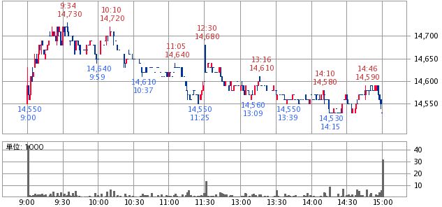 それに対してファナックは前場の相場の安定していた時間帯や安値に落ち込んだ時間帯、後場のギャップアップ、14:50過ぎから14:58へ僅か2・3分の間での急落といった辺りは後場の寄り付きの14,680円という後場の最高値となった株価が直ぐに約50円の急落となってその水準で後場の大半の時間帯で安定してしまったという点が日経平均とは異なる展開といえそうです。