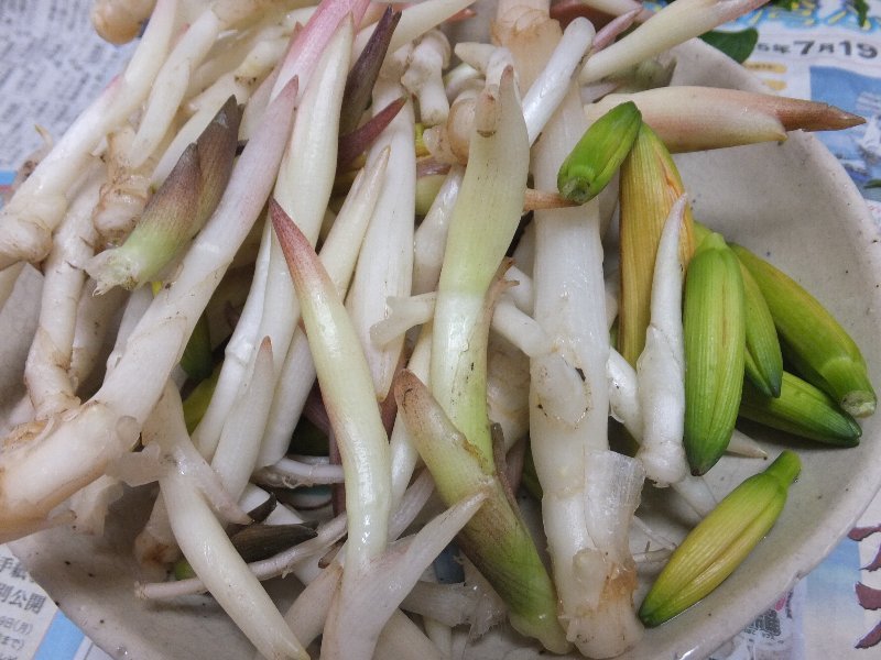 写真は茗荷の子の未熟ものとヤブカンゾウの蕾です