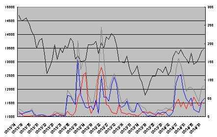 ちなみに日経平均が黒、青と赤の合計数が灰色の線になっています。