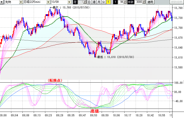日経225mini先物チャート(下) : 96ティック足
