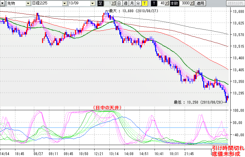 指標ラインの密集点が天底・転換点を示します。指標の見方