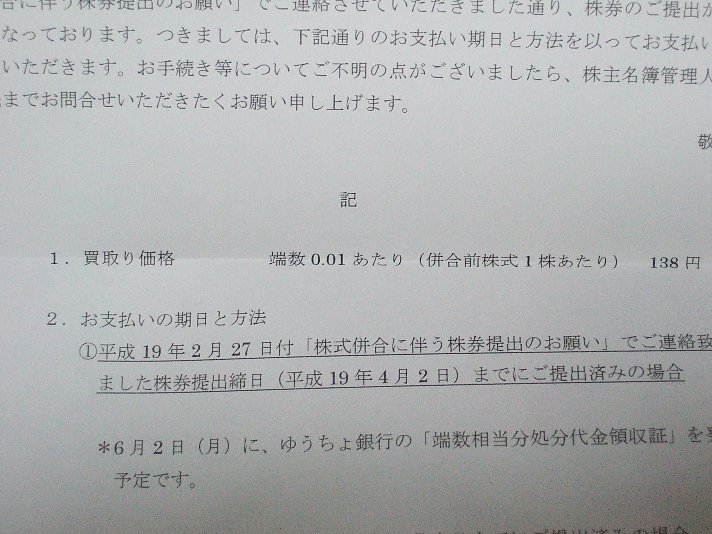 2007年4月をもって、ライブドア株100株は1株に併合となり、端株はライブドアが買い取ることになっていました。裁判所が許可した端株買取価格は端株0.01株あたり138円に決定しました。6月以降に現金が支払われます。