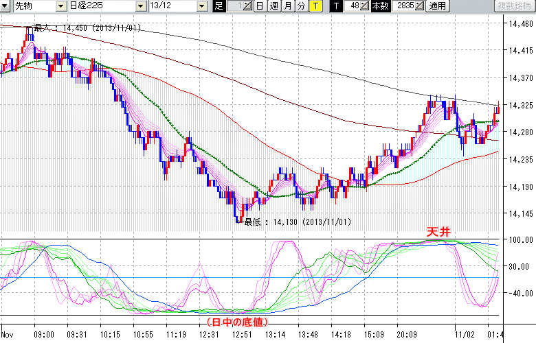 指標ラインの密集点が天底・転換点を示します。指標の見方