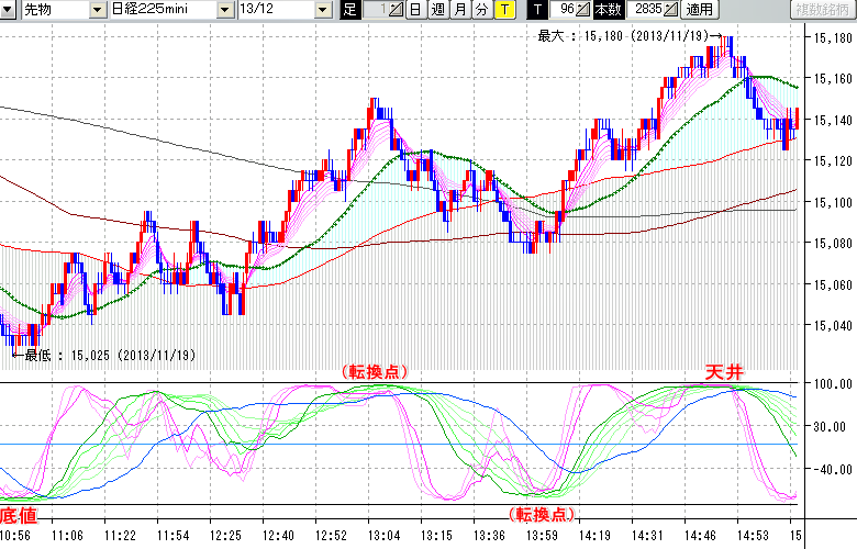 指標ラインの密集点が天底・転換点を示します。指標の見方