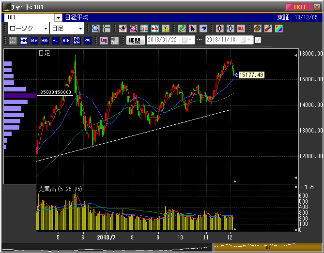 日経平均の写真に支持線を引いてみたが、上の支持線で下げ止まるのが買い方の理想だろう。