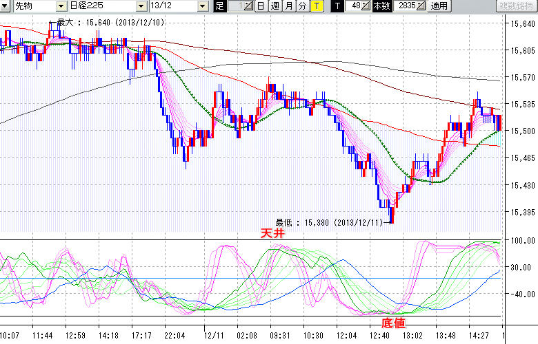 指標ラインの密集点が天底・転換点を示します。指標の見方