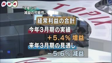 NHKのニュースを見ていたら、東証一部に上場している企業のことし3月期の決算は、これまでに全体のおよそ3分の1が発表されましたが、輸出の伸びなどで引き続き増益となっているものの、来年3月までの業績については減益を見込む企業が相次いでおり、今年度は、経常損益の合計が7年ぶりに減益に転じる可能性が強まっています。とのこと。