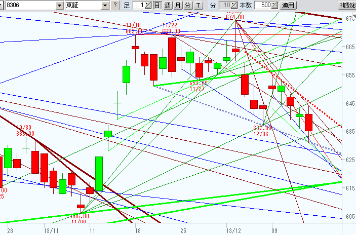 サポートB(2013年11月08日安値606円から2013年12月06日安値637円の延長)