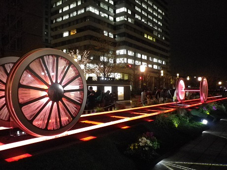 電車の車輪やSLの動輪をモチーフにしているようです。ときどき蒸気を上げたりも。