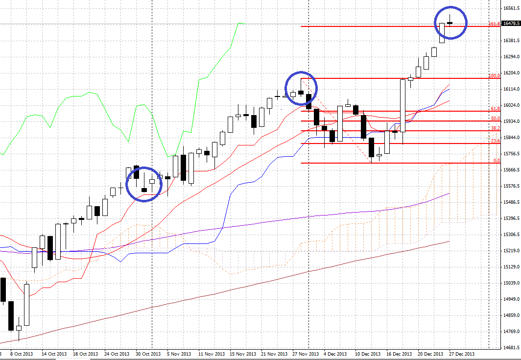 NYダウの日足チャートに下降サインである「長い上ヒゲ」が登場。