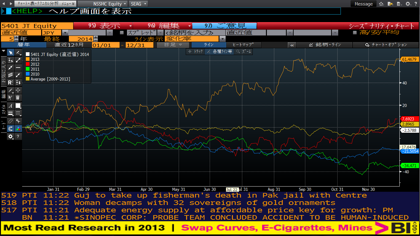 2013年を除き1-3月が年間のピークをつけていることが多く、(配当を考慮しても)