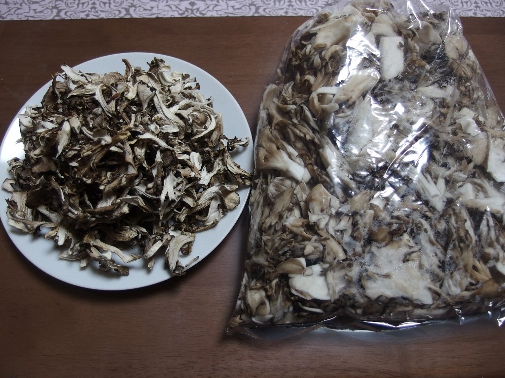 マイタケのカット屑を安く売ってるところがあるので、温風ヒーターの風でカラカラに干してます