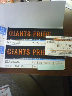 年間予約席の券2枚友人からもらいました。残念ながら1塁側(巨人側)でした。CARPの応援できず・・・